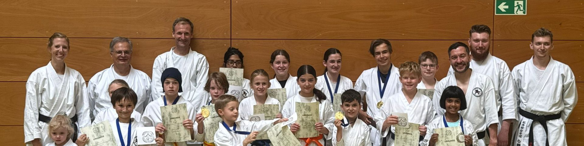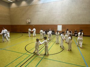 Am 30.08.2025 trafen sich unsere Kids mit Aktiven aus dem befreundeten Verein Shotokan Karate Dojo Seeheim, um ein erstes Karateturnier durchzuführen. Zum Aufwärmen und vor allem zum Kennenlernen fand eine Unterrichtseinheit Selbstverteidigung statt, in der insbesondere Wert auf verbale Selbstverteidigung und Griff lösen/sprengen eingegangen wurde. Danach wurden die Aktiven in 3 Gruppen aufgeteilt. Analog offizieller Meisterschaften traten immer 2 Aktive „gegeneinander“ mit der gleichen Kata an und die Kampfrichter beurteilten, wer nun weiterkommt. Die Aufregung aller war groß, was auch der Hauptgrund für das Turnier war, nämlich Wettkampfluft zu schnuppern. Damit alle mindestens 2 mal an die Reihe kommen, wurde das Doppel KO System verwendet. Nach der Siegerehrung gab es noch reichlich Kuchen und viele Unterhaltungen. Die Betreuer waren sich alle einig, nächstes Jahr wieder.